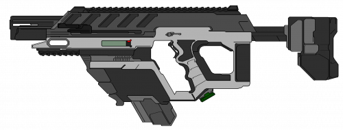 A compact rifle caliber personal defense weapon based on the 'Kist-type' common receiver system it is manufactured by a wide variety of licensed and illicit organizations within the Colonial Pact. Due to parts commonality with other Kist type weapons it is widely employed by the Colonial Pact military, civil, and private security forces and organizations. The Kist-VSBR or Very Short Barrel Rifle was designed as a personal defense weapon for use by vehicle crew, behind the lines troops, logistical personnel, and various non-frontline combat postings. Wildly successful in these roles it further found itself as a favorite weapon among various private interests due to the same reasons it was popular with military forces, its compact size, its common parts pool with other equally popular Kist type weapon systems, and its general ease of use.